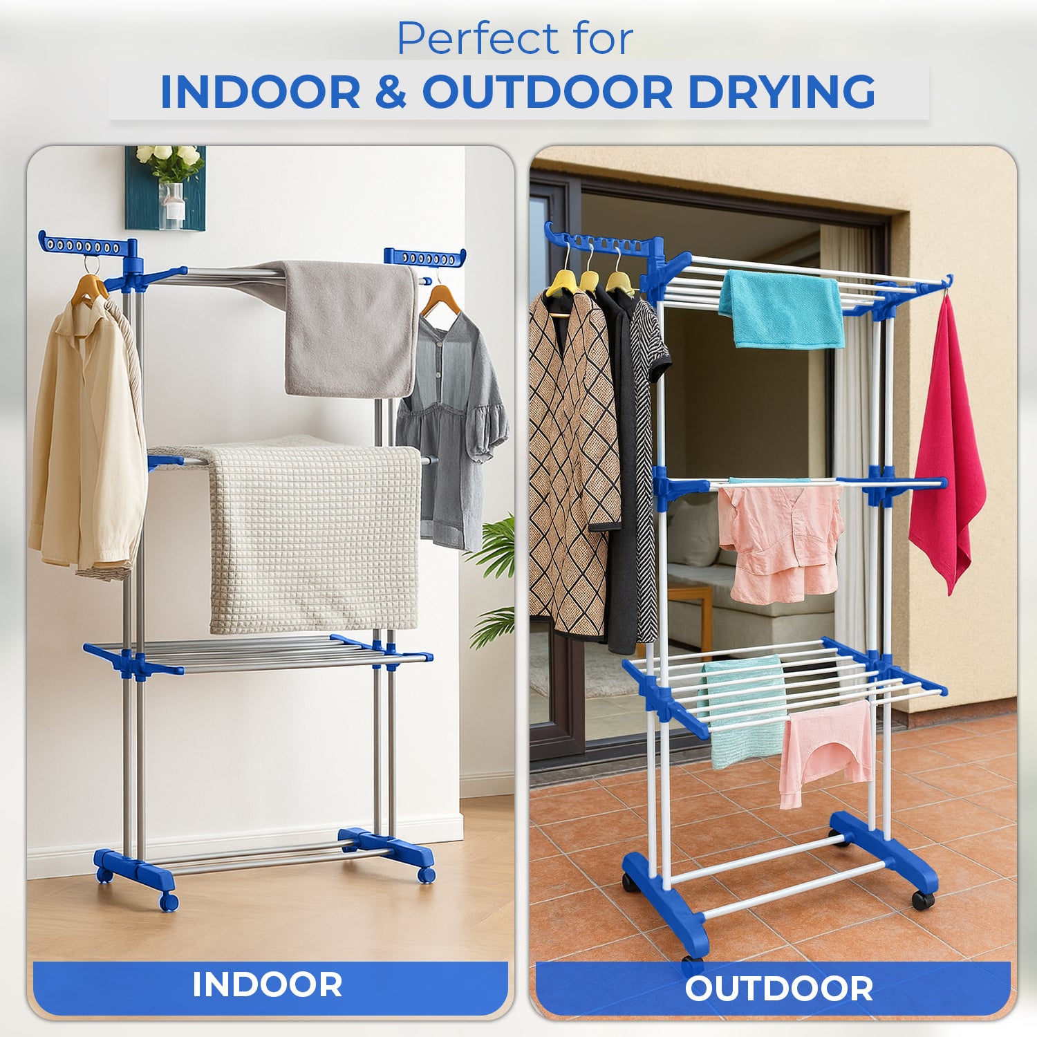 - Portable with Smooth-Rolling Wheels – Equipped with sturdy caster wheels, this rack glides effortlessly from room to room or from indoors to outdoors. Whether placed in your laundry room, on the balcony, or in the garden, it provides flexible drying wherever you need it.