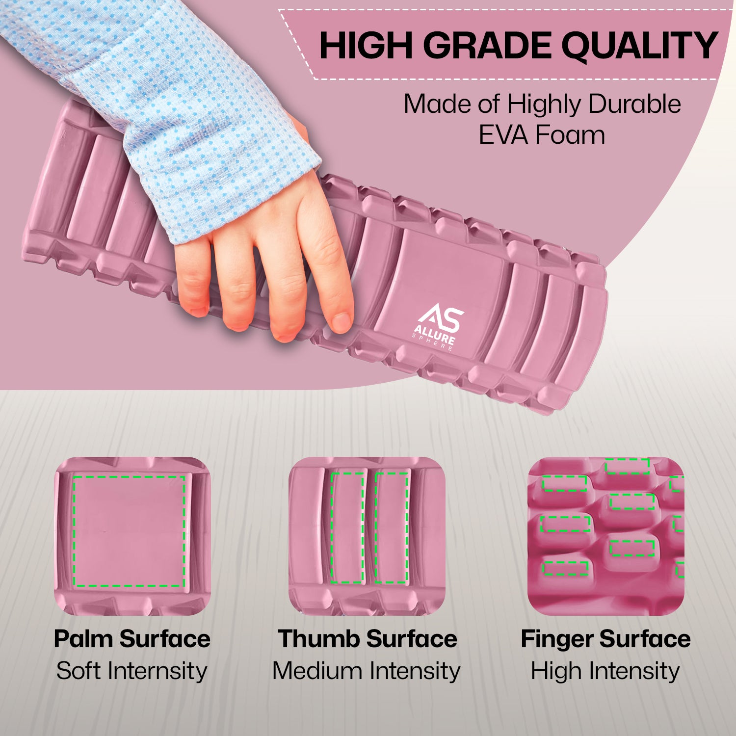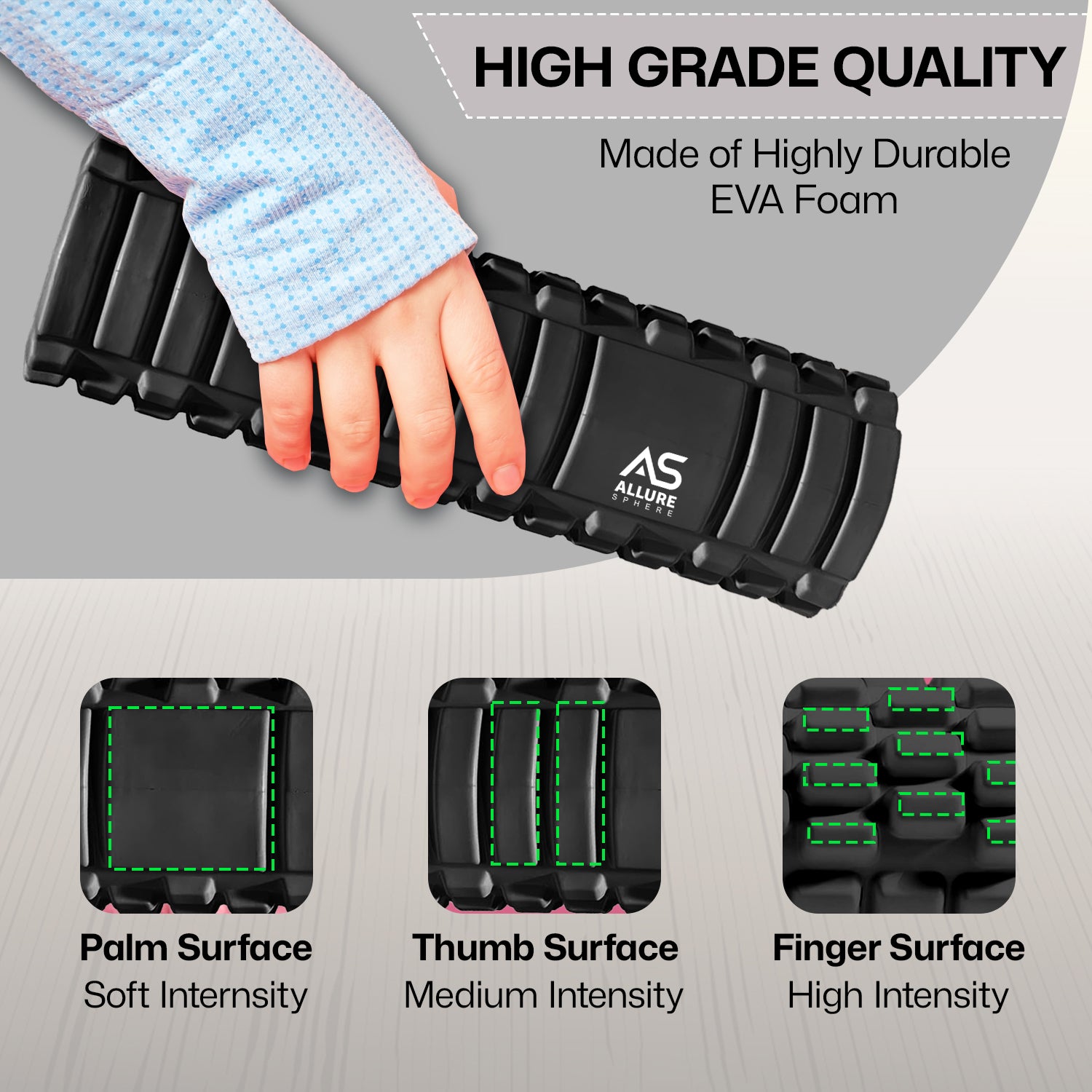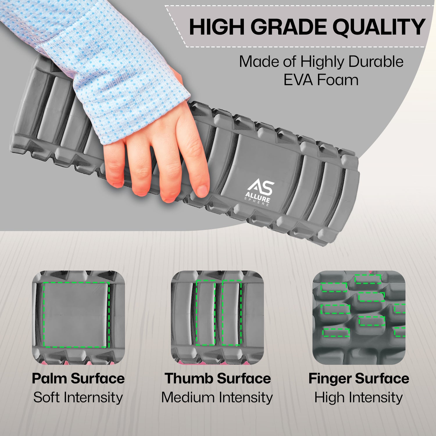The Allure Sphere yoga foam roller boasts exceptional durability, thanks to its construction from premium, dense EVA foam. This high-quality material not only withstands stress but also provides the perfect balance of comfort and support during your rolling exercises.